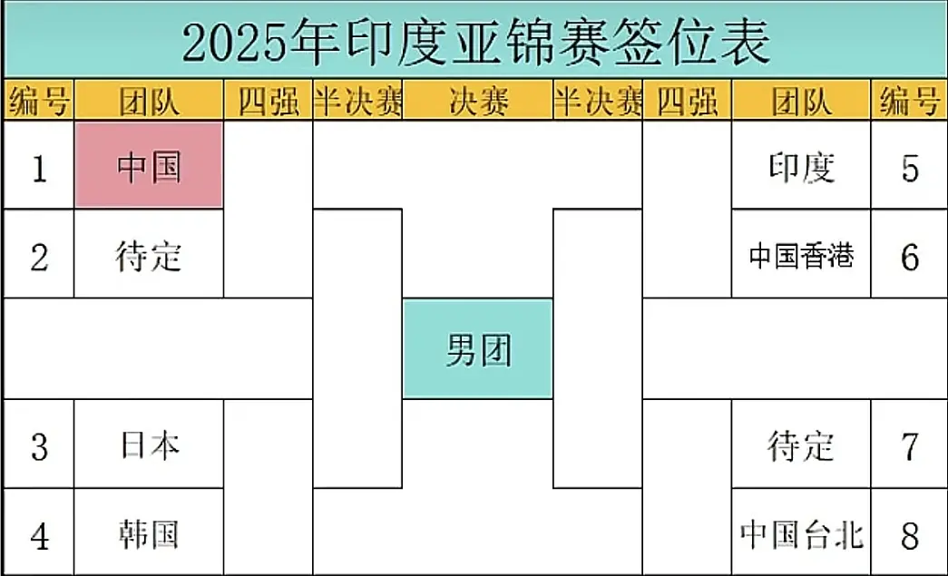 男团签表中,中国队以1号种子身份占据上半区,首轮对手为待定队伍(TBD),只要正常发挥,男团大概率能轻松闯进半决赛,之后就算碰到日本或韩国队的胜者,凭实力也有很大把握拿下。