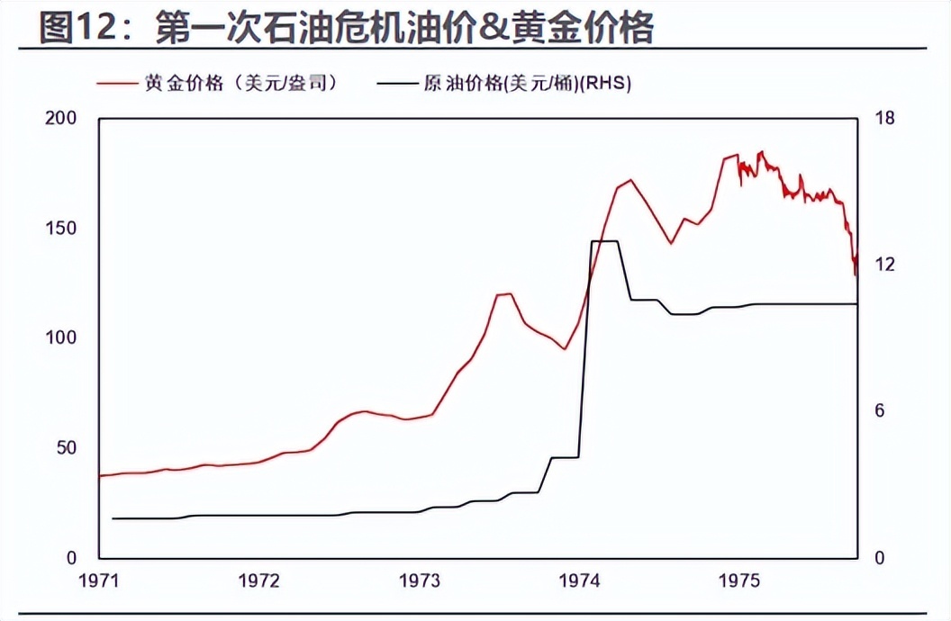 1973年第四次中东战争:油价飙升,黄金启动第一轮主升。天风证券(维权)复盘指出,1973年10月第四次中东战争爆发,OPEC宣布石油禁运,国际油价从每桶2.5美元左右跃升至近12美元,美国经济开始走入“滞胀”——通胀率飙升,GDP转负陷入衰退。这一阶段,黄金的“抗通胀属性”和“避险属性”引发资金簇拥,价格大涨,从1971年布雷顿森林体系解体后的自由浮动价,到1974年末已涨至180美元/盎司左右。